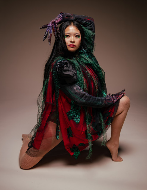 “...I am inspired by ephemeral moments in nature and the wildlife of my home. Each look is brought to life through contemporary dance movement and gestures, and is a nod to my roots growing up at a dance studio that took great care in detailing costumes and sharing dance as an artform...I aim to share the beauty of the natural world and transform the formidable creatures [cryptids] of folklore into symbols of strength and decadence…”